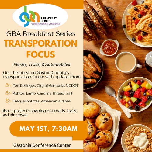 Megan Zelaski GBA Breakfast Series: Transportation Focus Join us for the next installment of the GBA Breakfast Series as we explore the future of transportation in Gaston County! Hear updates and insights from local and regional leaders on key projects shaping our roads, trails, and air travel: Tori Dellinger, City of Gastonia, NCDOT Ashton Lamb, Carolina Thread Trail Tracy Montross, American Airlines Enjoy a delicious breakfast and connect with fellow professionals while learning more about the infrastructure developments that will impact our community. Don’t miss this informative and engaging morning!Date and Time